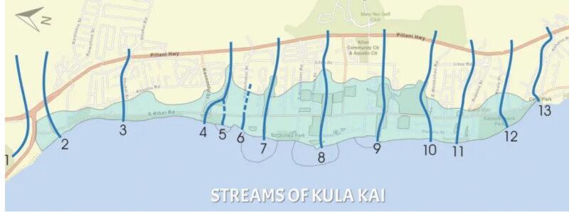 Work has been done on some streams in South Maui that were subject to flooding earlier this year including the Keahuaiwi (1), Waiakoa (2), Ohukai (3), Kulanihakoi (4), Koieie (5), Waiohuli (6), Waipuilani (7), Kawililipoa (8), Laie (9), Keokea (10), Waimahaihai (11), Kihei (12) and Kaluaihaikoko (13) streams. Save The Wetlands Hui/David Dorn