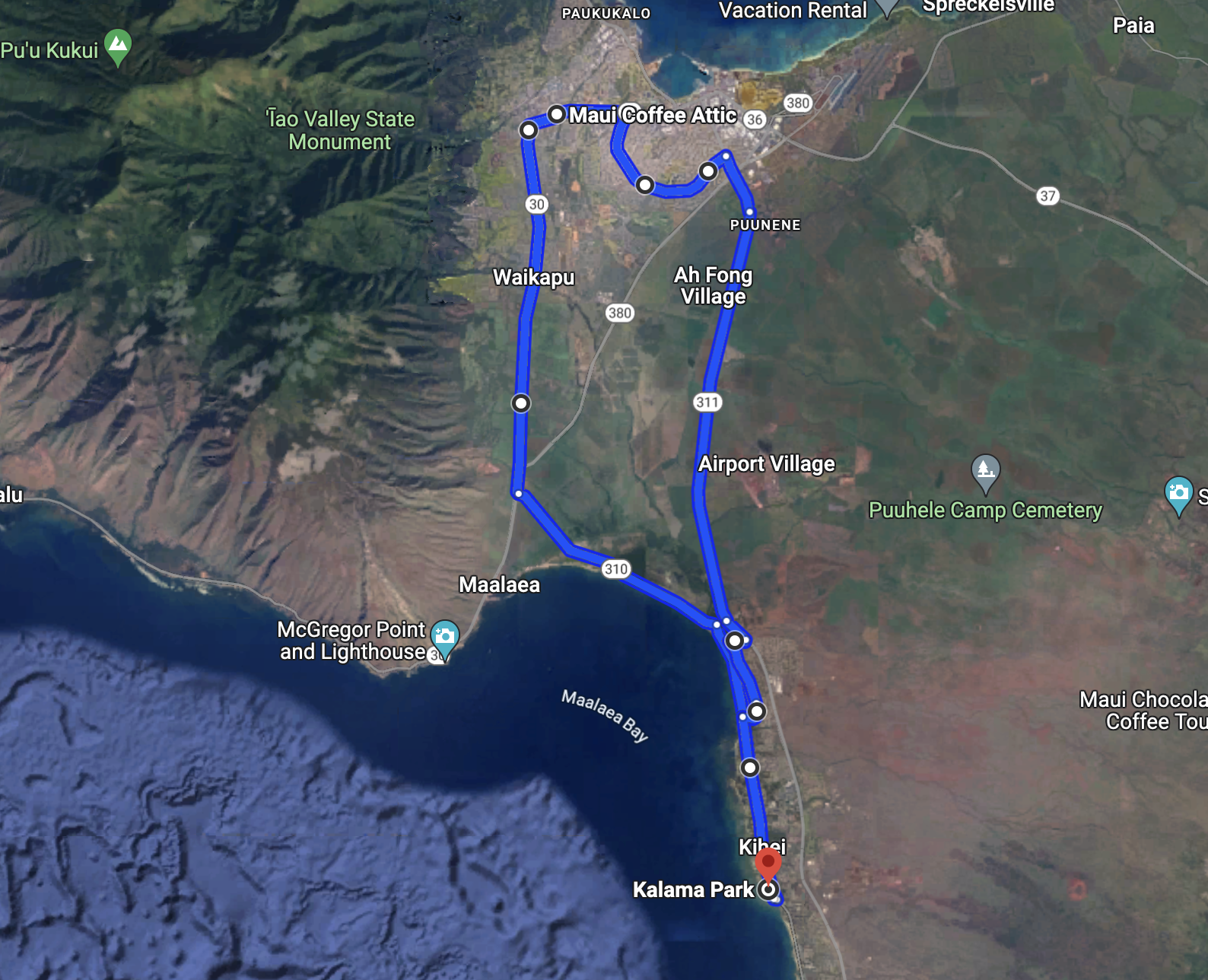 WHERE: We will meet at Kalama Park and ride 14 miles north in the designated bike lane on the Honoapiilani Hwy until we reach Maui Coffee Attic in Wailuku. The group will stop for coffee and refreshments before heading back to Kalama Park on the bike path of Maui Veterans Hwy.